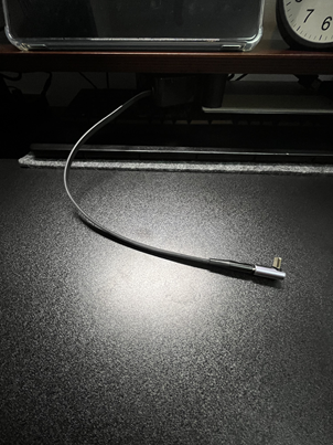 巻取り式の充電コードにマジックテープを貼り、シェルフ天板裏に取り付ければ手元でも充電が可能に。